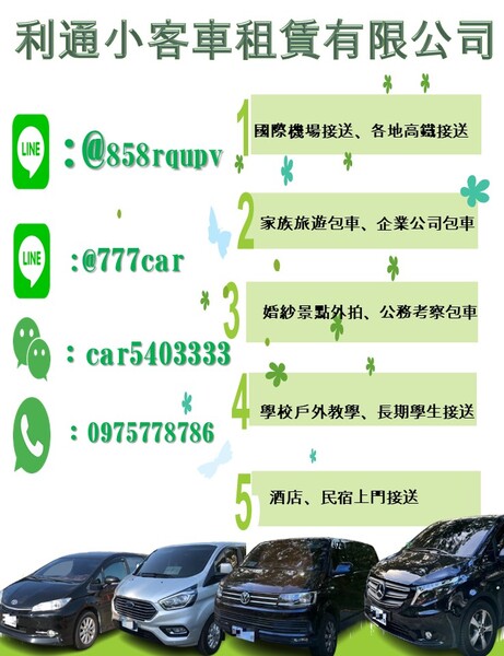 五人座、七人座、九人座 彰化/台中/苗栗/新竹 包車旅遊/機場接送/登山接駁 合法租賃公司24H服務 LINE詢問 : @777car Wechat : car5403333 諮詢請於上班時間諮詢 上班時間服務中心有專人服務