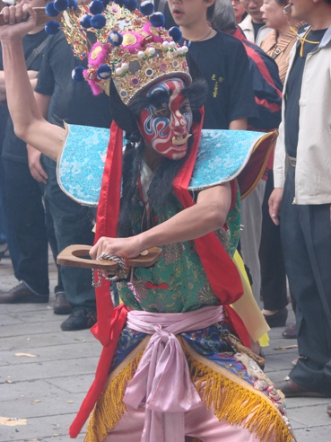家將的臉譜各有特色,手裡拿的刑具也不同