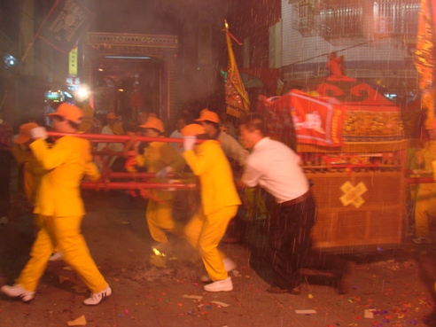 漫天煙花,進香媽的神轎在三進三退的「犁轎」大禮中駐駕奉天宮